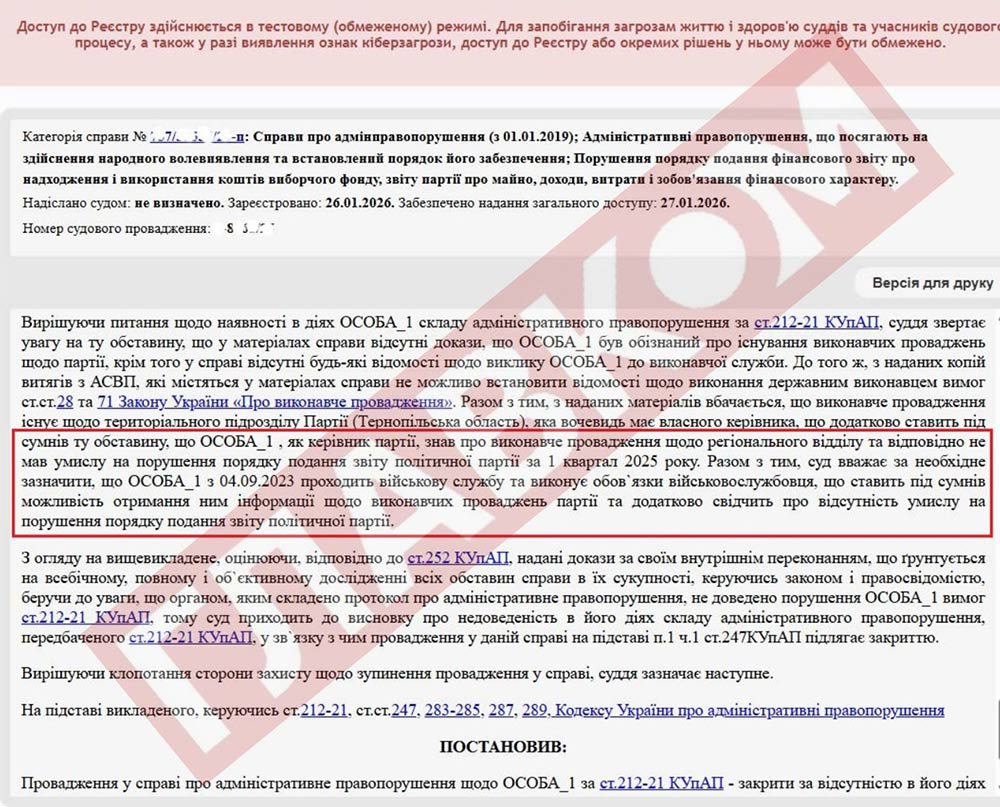 Водночас суд дійшов висновків: у матеріалах справи відсутні докази, що Олег Ляшка був обізнаний про існування виконавчих проваджень щодо партії. Більше того, у судовій постанові зазначено, що у тернопільській територіальній організації Радикальної партії є свій керівник, а тому Феміда вважала, що Ляшко не мав умислу на порушення порядку подання звіту політичної партії за I квартал 2025 року.