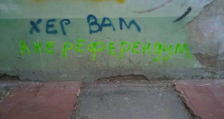 У тимчасово окупованому Херсоні українці розмалювали стіни написами проти «референдуму» про приєднання до Росії, про підготовку до якого заявляли колаборанти. Про це повідомив в Telegram перший заступник голови Херсонської облради Юрій Соболевський.