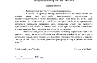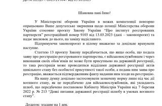 Так, у відповіді міністра оборони Рустема Умєрова зазначається, що законопроєкт про реєстровані партнерства підтримують у цілому. А втім, пункт про те, що заяву військового про партнерство можуть зареєструвати без його/її фактичної присутності, поки боєць виконує свої обов'язки, пропонують застосовувати лише під час воєнного стану.