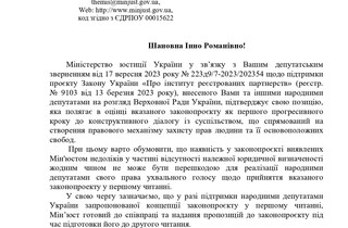 Міноборони змінило позицію й підтримало законопроєкт про реєстровані партнерства. Міністерство юстиції також готове підтримати законопроєкт і готує до нього правки до другого читання. Про це заявила народна депутатка Інна Совсун.