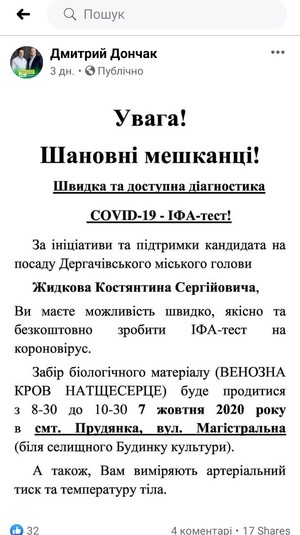 «За ініціативи та підтримки кандидата на посаду Дергачівського міського голови Жидкова Костянтина Сергійовича проводиться аналіз крові (ІФА-тест на коронавірус)», – сказано в оголошенні.