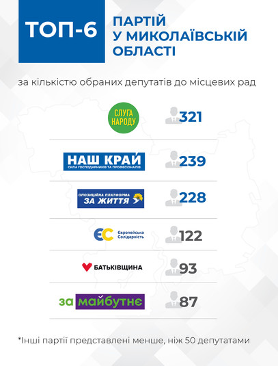 На Миколаївщині «Слуга народу», «Наш край» і ОПЗЖ провели більше всіх депутатів до місцевих рад