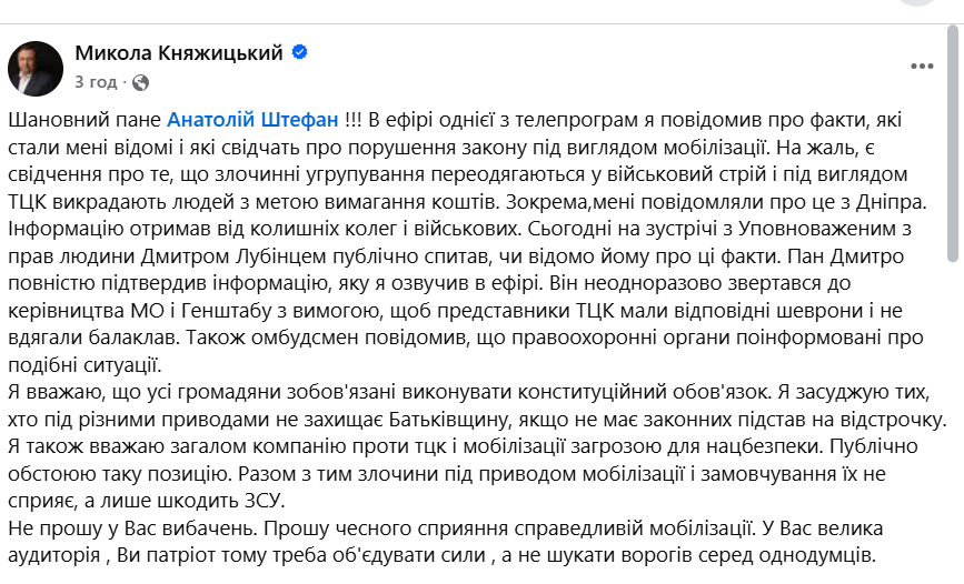 «В ефірі однієї з телепрограм я повідомив про факти, які стали мені відомі і які свідчать про порушення закону під виглядом мобілізації. На жаль, є свідчення про те, що злочинні угрупування переодягаються у військовий стрій і під виглядом ТЦК викрадають людей з метою вимагання коштів. Зокрема, мені повідомляли про це з Дніпра. Інформацію отримав від колишніх колег і військових», – наголосив Княжицький.
