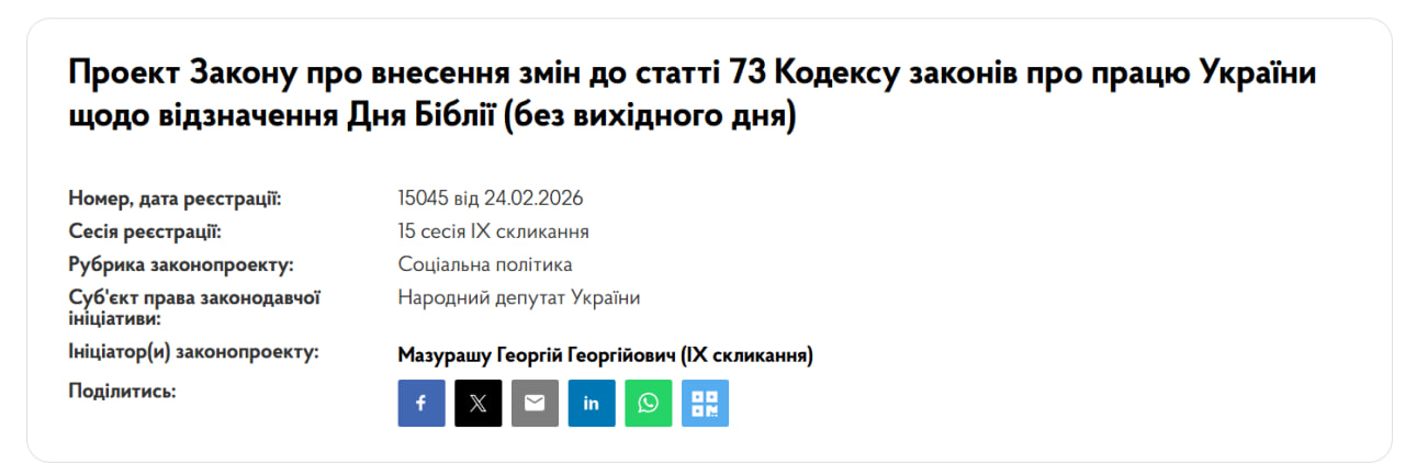 Народний депутат Георгій Мазурашу зареєстрував новий законопроєкт №15045 від 24 лютого 2026 року. Він передбачає запровадження в Україні нового свята – Дня Біблії без надання вихідного дня. Про це йдеться на сайті Верховної ради, пише «Главком».