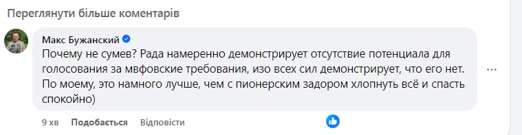 Народний депутат від «Слуги народу» Максим Бужанський, коментуючи брак голосів заявив, що парламент не зміг зібратися через нібито небажання голосувати за вимоги МВФ. За його словами, депутати «всіма силами показують відсутність бажання».