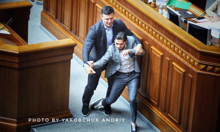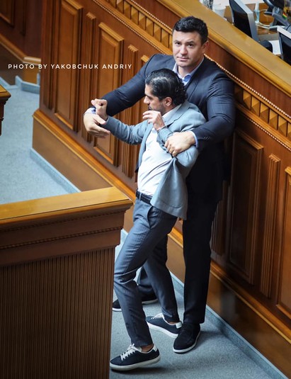 Заступнику голови фракції «Слуга народу» Миколі Тищенку не сподобалася критика на адресу Офісу Зеленського, яку висловлював з трибуни Верховної Ради колишній «слуга народу», а наразі позафракційний депутат Гео Лерос. Тому він вирішив просто підійти до Лероса та відтягнути його від трибуни. Цей «танець» нардепів зафіксували фотографи.
