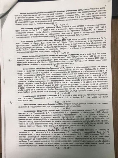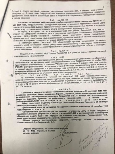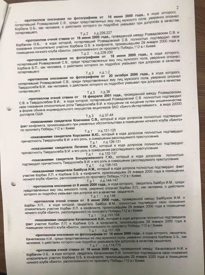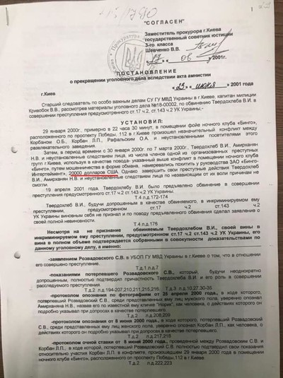 За його словами, у процесі перевірки встановлено, що Микола Тищенко разом з Віталієм Твердохлібом і Норіком Амірханяном у період з 30.01.2000 до 07.03.2000 безпідставно, погрожуючи вбивством, вимагали 20000 тисяч доларів США у генерального директора клуба «Бінгo«, що знаходиться в м.Києві, – Разводовського С.В.