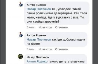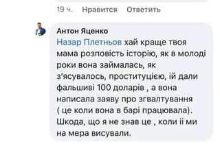 У відповідь на слова Пустової в коментарях на Facebook Антон Яценко коротко відповів: «Пнх пдрска». Згодом нардеп видалив свої образливі коментарі з-під допису.