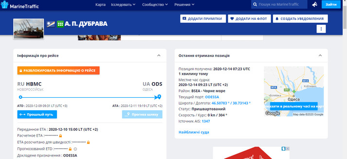 Коли цей матеріал уже вийшов, стало відомо, що ще 10 грудня біля 46 причалу одеського порту ошвартувався рудовоз «Діброва» під прапором Маршаллових островів. Судно прийшло до Одеси з Новоросійська і стоїть під навантаженням 15 тисяч тонн ільменітової руди. Порт призначення поки не відомий.