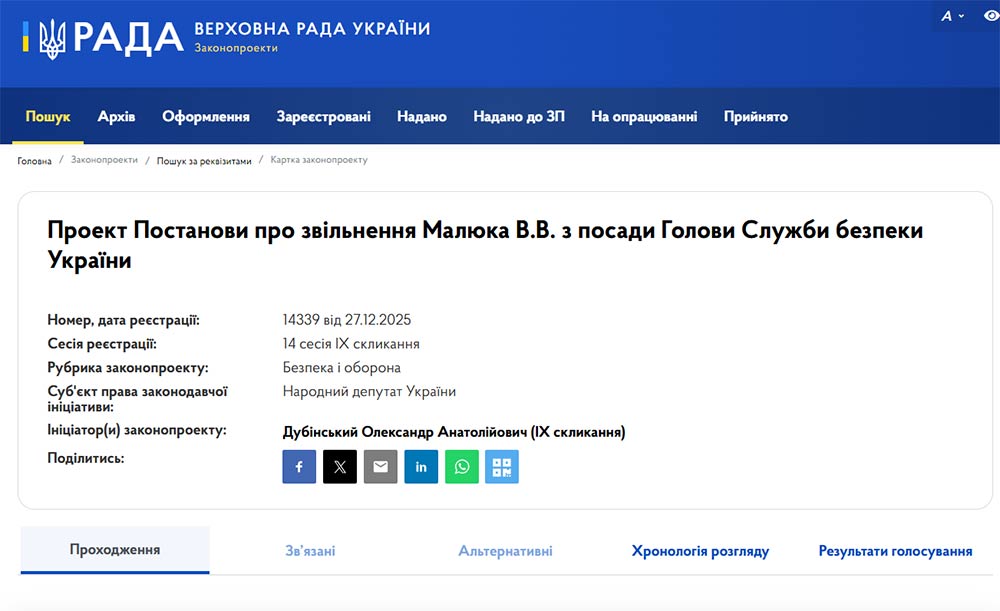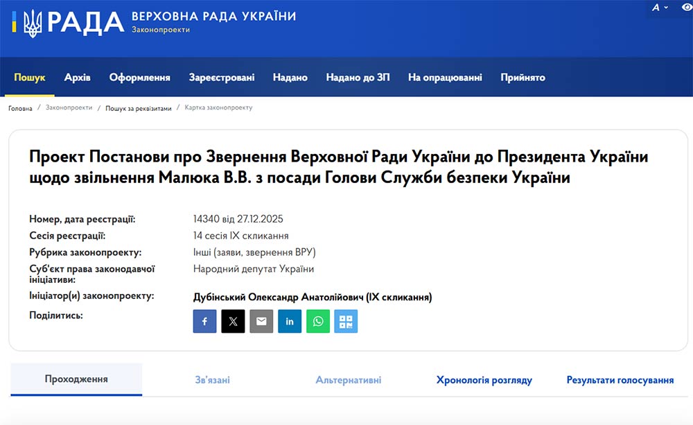 Крім того, Дубінський зареєстрував окремий проєкт постанови про звільнення Василя Малюка з посади голови СБУ.