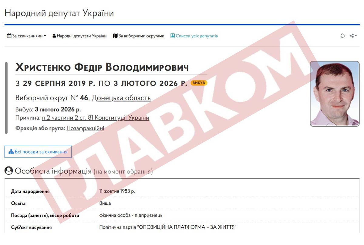 Датою вибуття з Верховної Ради вказано 3 лютого 2026 року. Підстава для втрати мандата – пункт 2 частини 2 статті 81 Конституції України («Повноваження народного депутата України припиняються достроково у разі набрання законної сили обвинувальним вироком щодо нього»).