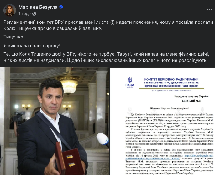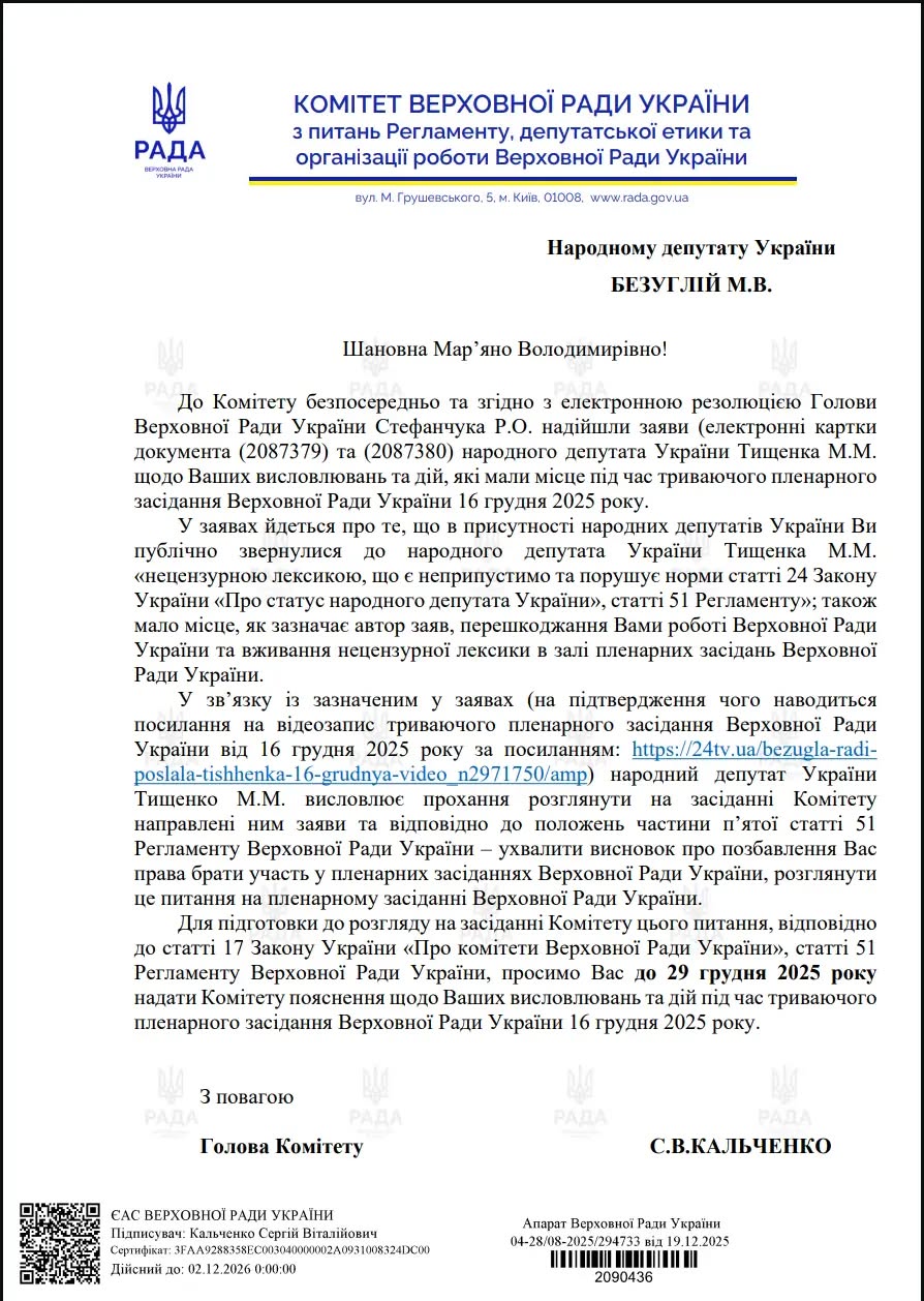 Комітет Верховної Ради України з питань регламенту, депутатської етики та організації роботи парламенту надіслав листа нардепці Марʼяні Безуглій з вимогою пояснити, чому вона використала нецензурну лексику щодо парламентаря Миколи Тищенка під час одного із засідань Ради. Про це повідомляє «Главком».