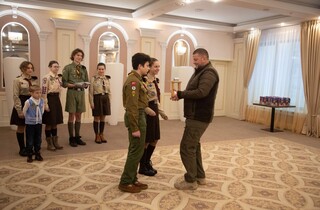 В свою чергу, головнокомандувач ЗСУ підписав скаутам прапор, футболку для благодійного аукціону та вручив солодкі подарунки.