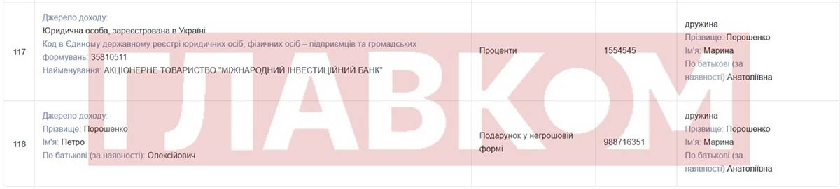 Ідеться про подарунок у негрошовій формі на суму 988,71 млн грн. Як випливає з декларації політика, Петро Порошенко подарував Марині Анатоліївні цінні папери.