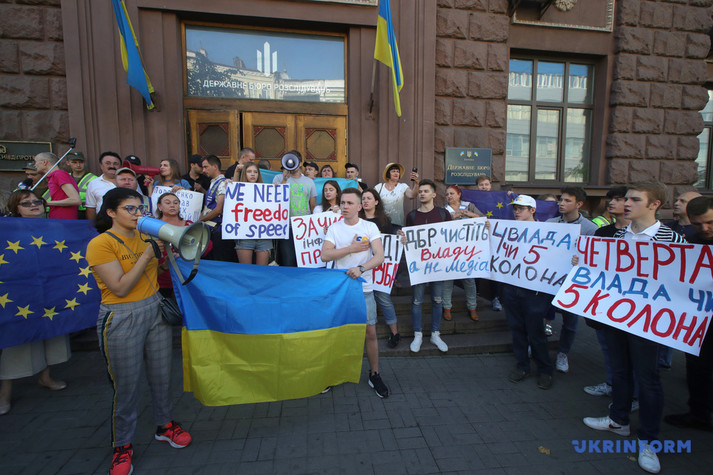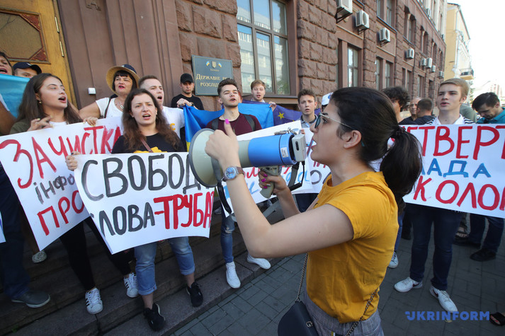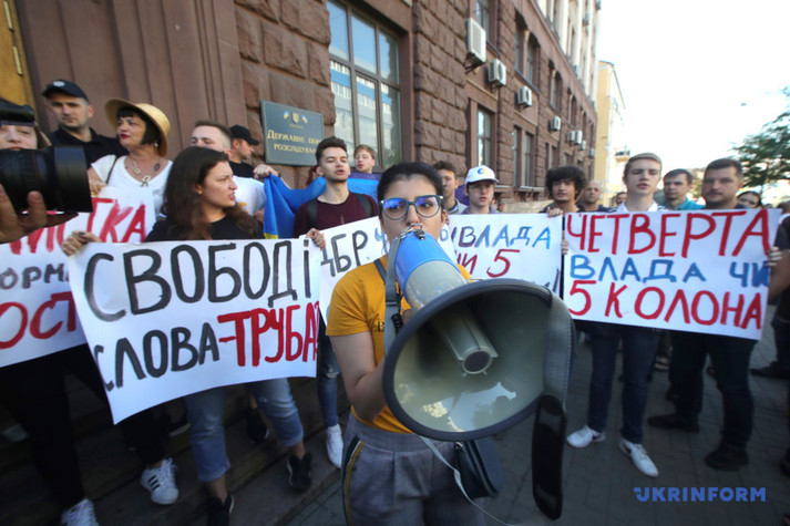 У руках у дітей експрезидента - гасла «Четверта влада чи п'ята колона?», «ДБР, чистіть владу, а не медіа», «Свободі слова – Труба». Останню фразу вони скандують.