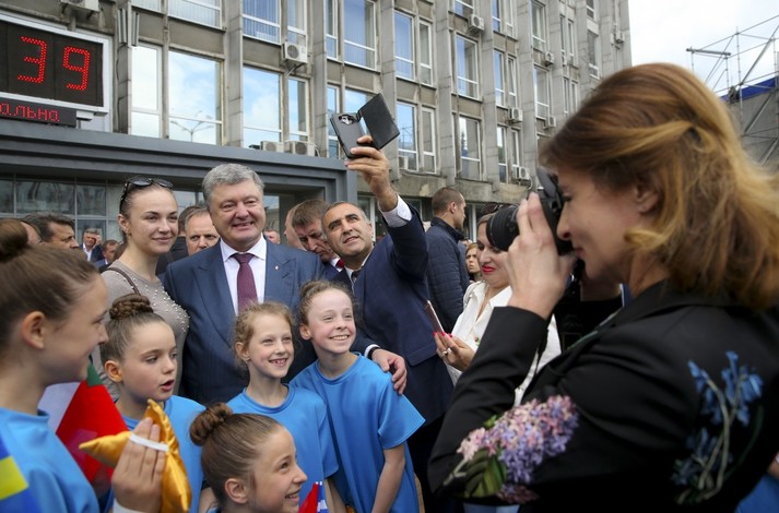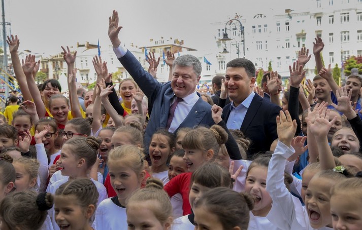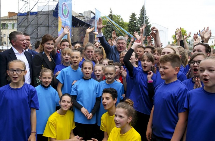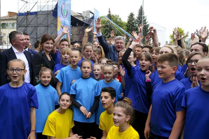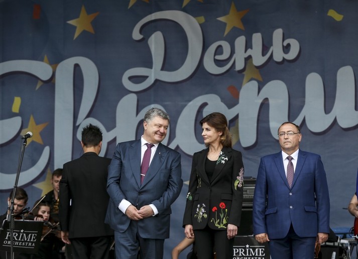 Глава держави з дружиною, а також прем'єр-міністр Володимир Гройсман взяли участь у церемонії підняття прапора Євросоюзу на головній площі міста разом учнями Кирилом Бедраком та Діаною Підкалюк.