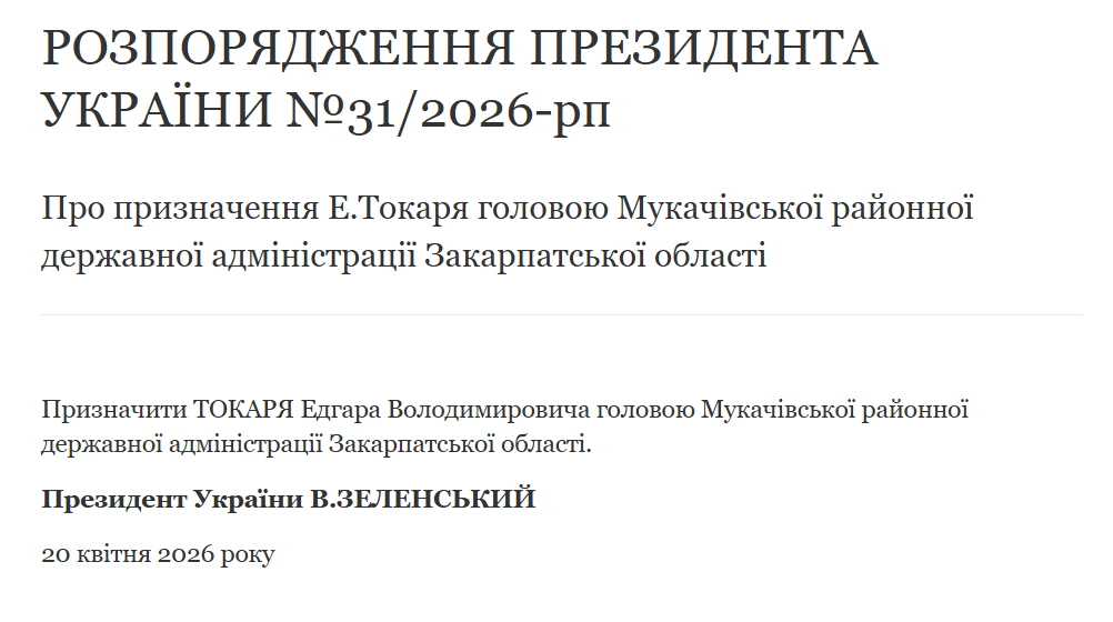 Сьогодні, 20 квітня, президент України Володимир Зеленський призначив Едгара Токаря головою Мукачівської районної державної адміністрації Закарпатської області. Про це повідомляє «Главком» з посиланням на розпорядження глави держави №31/2026-pп.