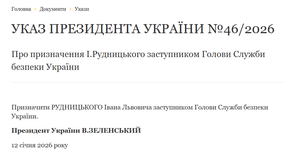 «Призначити Рудницького Івана Львовича заступником голови Служби безпеки України», – йдеться в указі.