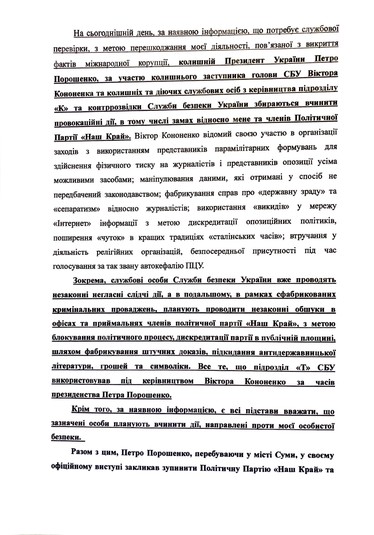«Прийшовши сьогодні вранці в офіс «Нашого Краю» у Сумах співробітники виявили, що вхідні двері важко відчиняються. Під час перегляду відео з камер спостереження помітили людину, яка вночі проникла в офіс та підкинула пакет. Цей пакет був виявлений партійцями під час огляду приміщення. У пакеті знаходилися пачки з доларами та російськими рублями в обгортці «Сбєрбанку Росії». Була викликана поліція та запрошені журналісти», - повідомив Олександр Мазурчак.