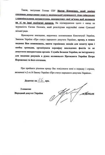«Минулого тижня народний депутат, член Політради партії Андрій Деркач звернувся із заявою до голови СБУ Івана Баканова. У заяві згадувалось про зухвалий виклик на розмову заступником начальника управління СБУ у Сумській області Лопаткіним кандидата на голову Конотопської ОТГ від партії «Наш край» Івана Огрохіна. Він вимагав від нашого однопартійця знятися з виборчих перегонів на користь кандидата від «Європейської Солідарності» Сергія Завгороднього», – підсумував Олександр Мазурчак.