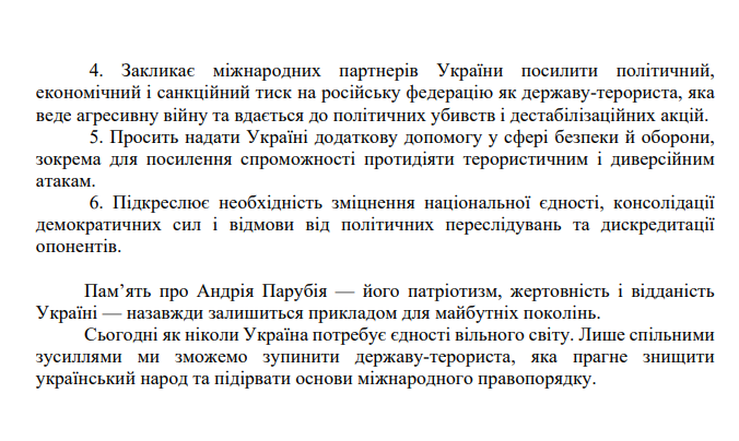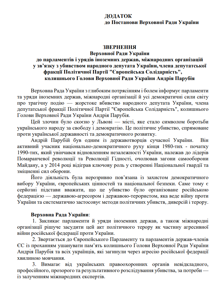 З'явився проєкт постанови про звернення Верховної Ради до парламентів і урядів іноземних держав, міжнародних організацій у зв’язку з убивством народного депутата Андрія Парубія. Про це повідомляє «Главком» з посиланням на картку законопроєкту.