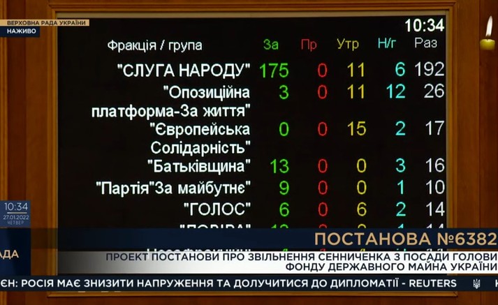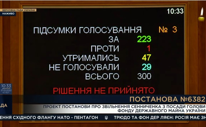 Народні депутати на пленарному засіданні в четвер, 27 січня, не змогли звільнити Дмитра Сенниченка з посади голови Фонду державного майна України (проєкт постанови №6382). У парламенті не вистачило голосів.