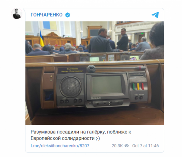 Вже колишній голова Верховної Ради Дмитро Разумков отримав нове місце у сесійній залі парламенту. Для Разумкова, який тепер працюватиме у Раді як позафракційний народний депутат, виділили місце у секції, яку ділять між собою фракції «Слуги народу» та «Європейської солідарності». Про це розповів народний депутат від «Європейської солідарності» Олексій Гончаренко.