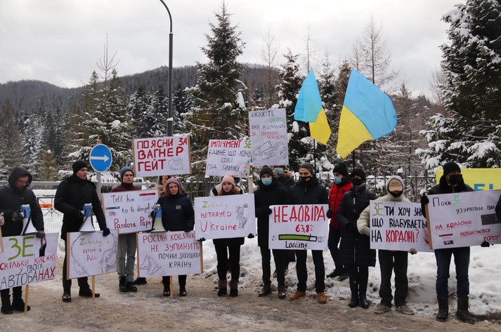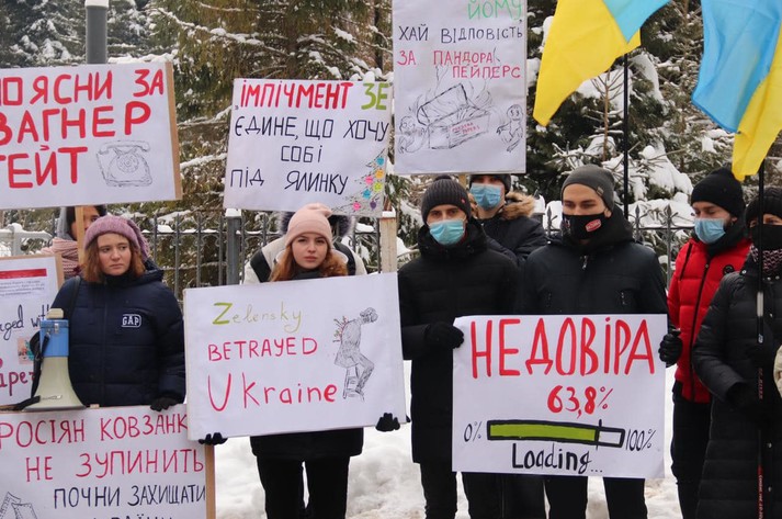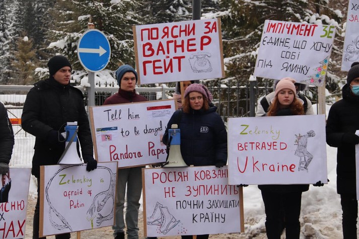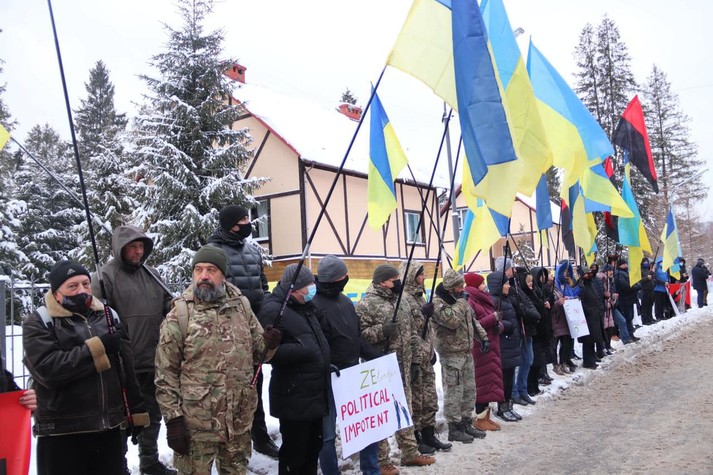 Декілька сотень активістів, зокрема партійців «Європейської солідарності», 22 грудня зібралися під державною резиденцією «Синьогора» у Гуті, де перебуває президент Володимир Зеленський з українськими дипломатами.