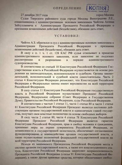 Але суддя Тверського районного суду Любов Виноградова винесла дві ухвали про відмову в прийнятті адміністративних позовів. Суддя аргументувала своє рішення тим, що президент Росії та його адміністрація є неосудними.