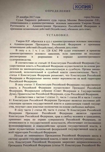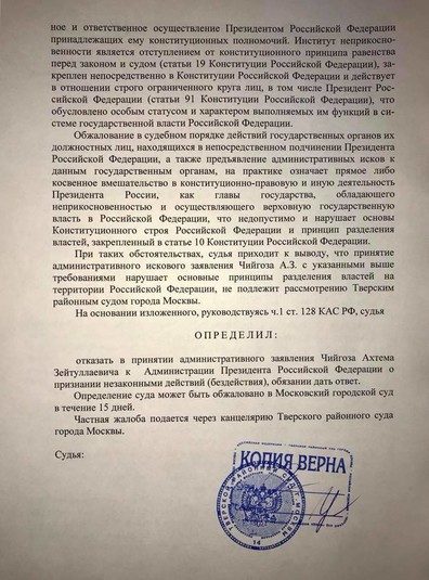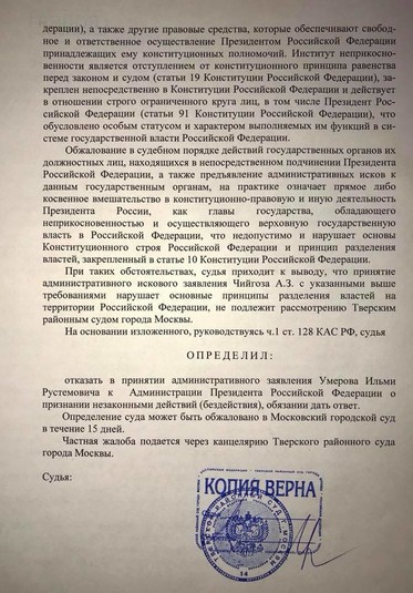 «Оскарження в судовому порядку дій державних органів, їх посадових осіб, що знаходяться в безпосередньому підпорядкуванні президента Російської Федерації, а також застосування адміністративних позовів до даних державним органам, на практиці означає пряме, або непряме втручання в конституційно-правову та іншу діяльність президента Росії, як голови держави, що володіє недоторканністю і здійснює верховну державну владу в Російській Федерації», - написала в ухвалі суддя.