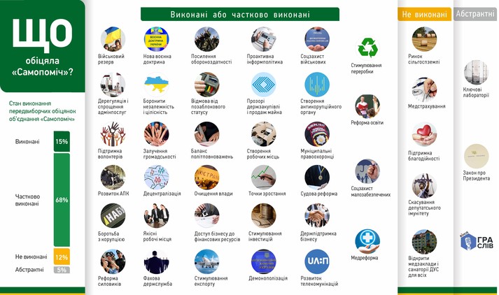 За ініціативи, що відповідають передвиборчій програмі «Самопомочі», в середньому голосує 71% її депутатів. Представники «Самопомочі» частіше за всі інші опозиційні парламентські фракції є співавторами законів, прийнятих на виконання передвиборчих обіцянок, - у 33% проаналізованих ініціатив. Разом з тим, цей показник значно нижчий, ніж у коаліційних фракцій.