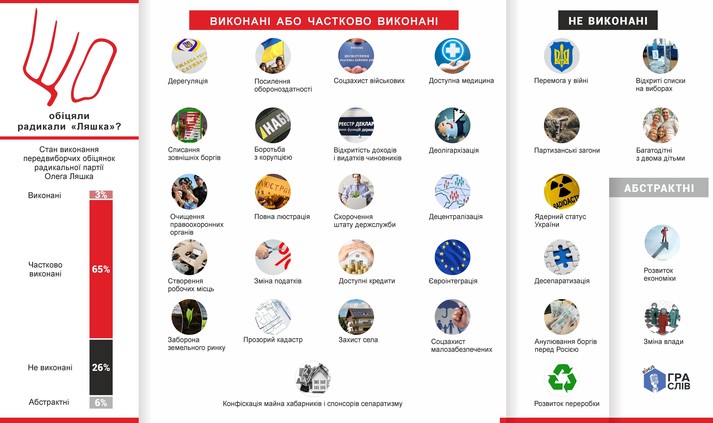 Радикальна партія Ляшка частково виконала в парламенті 68% передвиборчих обіцянок. Третина фракції, як правило, не голосує за закони, що відповідають програмним положенням «ляшківців».