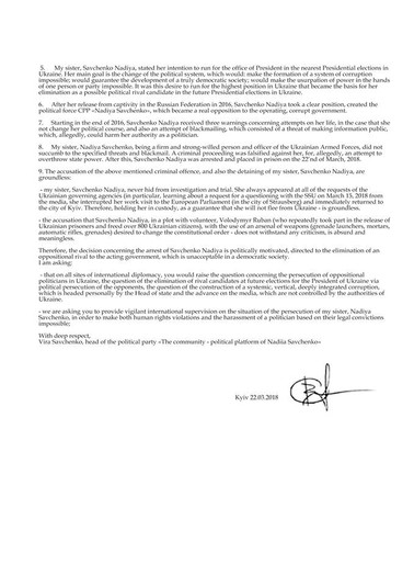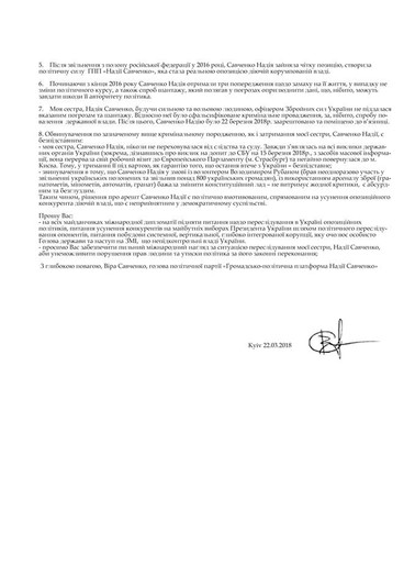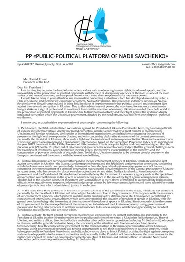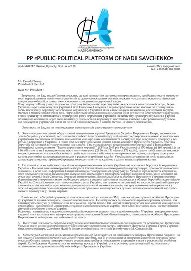 Сестра народного депутата Надії Савченко Віра написала листа американському президенту Дональду Трампу і попросила його звернути увагу на ситуацію з арештом і кримінальним переслідуванням політика. Свій лист вона опубліковала на своїй сторінці у соцмережі Facebook.