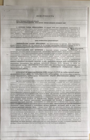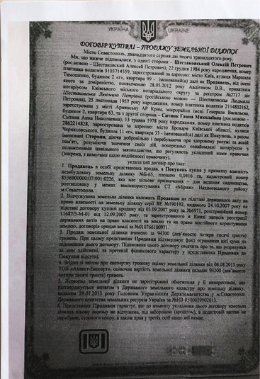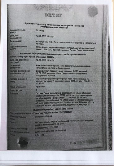 Ідеться про ділянку Б-65 (кадастровий номер 8536900000: 07: 001: 0226) у садовому товаристві "Міраж" у Нахімовському районі Севастополя, яку дружина Ситника оформила на себе за російським законодавством (новий, російський кадастровий номер - 91: 04: 007 001: 139) і продала за 900 тисяч російських рублів. У 2015 році Ганна Ситник дала доручення на право відчуження майна громадянці РФ Небивайловій. У той же день Артем Ситник дав своїй дружині згоду на відчуження вказаної ділянки, що також підтверджується документально. 1 серпня 2017 реєстраційними органами окупаційної влади РФ у м. Севастополь незаконно зареєстровано право власності Ситник Ганни Миколаївни на земельну ділянку площею 0,0416 га в Севастополі. У той же день Ситники через посередника продали ділянку за 900 000 російських рублів (продавець – Ситник Г.М.), із яких 6600 російських рублів сплатили в російський бюджет у вигляді мита. Фактично ж ділянка була продана ще дорожче – за 2 000 000 російських рублів, що випливає з розміщених оголошень про продаж. Ні в декларації дружини Ситника, ні в декларації самого Артема Ситника до операції з відчуження нерухомості та отримання коштів від її продажу не вказані.