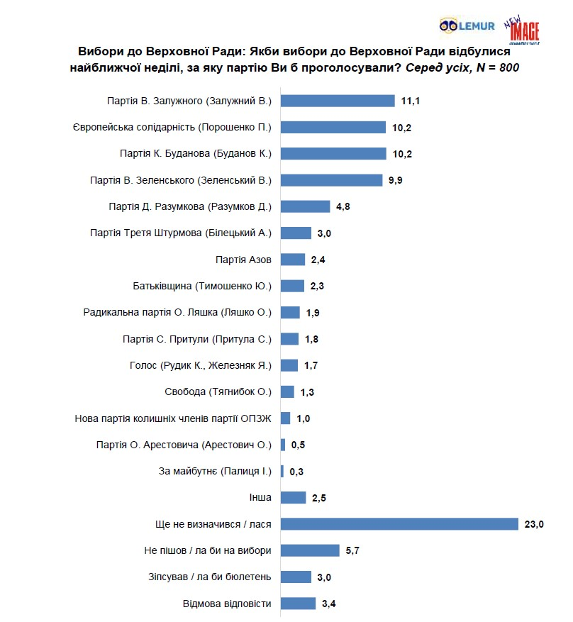 Негативну динаміку також демонструють політичні сили, асоційовані з президентом Володимиром Зеленським і Дмитром Разумковим. Зокрема, рейтинг проєкту Володимира Зеленського знизився до 9,9%, а підтримка партії Дмитра Разумкова – до 4,8%.