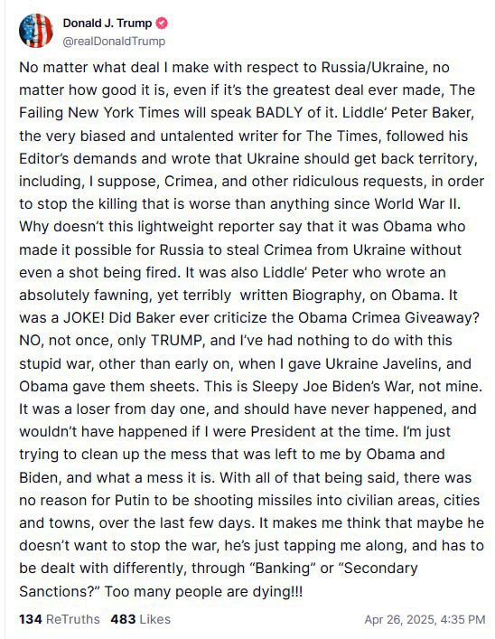 Крім того, Трамп зазначив, що яку б угоду він не уклав стосовно РФ і України, навіть якщо це буде найкраща угода в історії, то видання The New York Times «все одно говоритиме про неї погано».