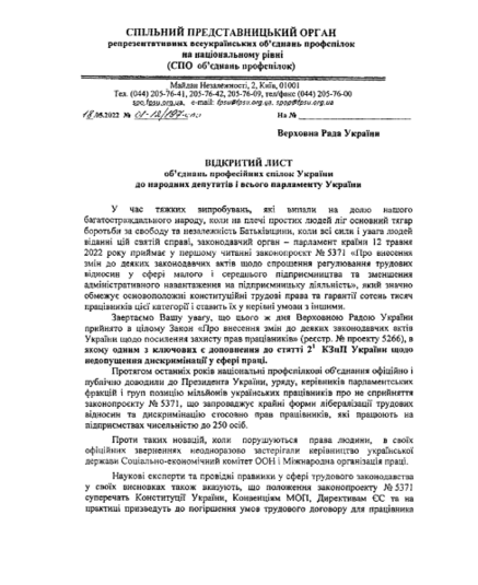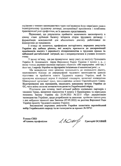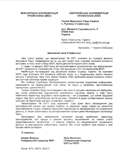 «Ми глибоко стурбовані безперервними регресивними трудовими реформами, не зважаючи на надзвичайний стан війни, які йдуть у напрямку, протилежному принципам і цінностям ЄС. Закликаємо вас забезпечити належний процес всебічного перегляду законодавства про працю», – йдеться у листі Міжнародної конфедерації профспілок до Голови Верховної Ради Руслана Стефанчука.