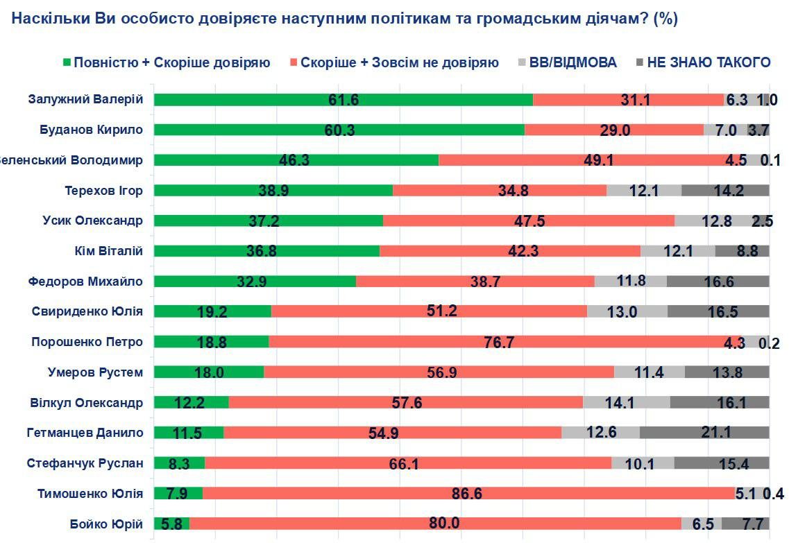 Буданов ділить лідерство у рейтингу довіри серед політиків та громадських діячів з Валерієм Залужним. Різниця між ними навіть менше рівня статистичної похибки (1,3%). Для порівняння, президент Володимир Зеленський має 46,3% довіри, а Петро Порошенко – 19,8%.