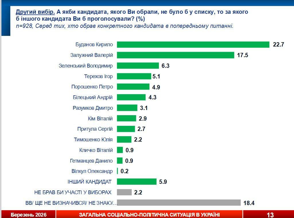 Крім того, у питанні «другого вибору» він демонструє найвищий показник – 22,7% респондентів готові віддати голос за Буданова, якщо їхній основний кандидат не братиме участі у виборах. Це свідчить про потенціал зростання його електоральної підтримки.