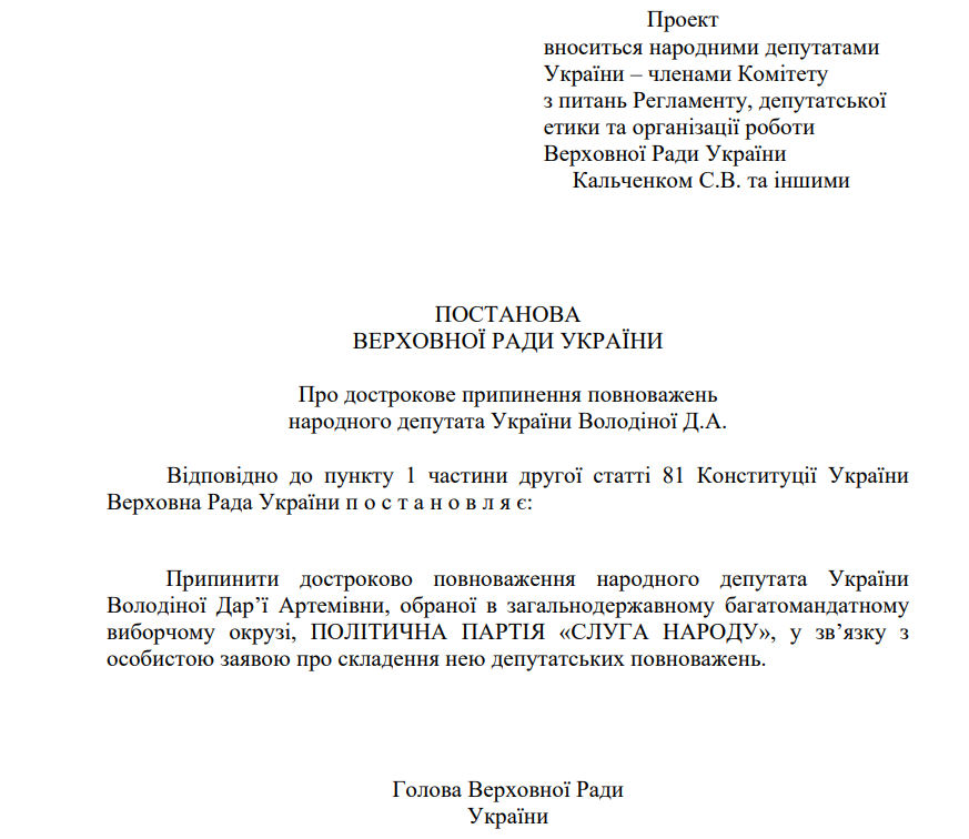 На сайті парламенту з'явився проєкт постанови від нардепа Сергія Кальченка про дострокове припинення повноважень народного депутата України Дар'ї Володіної. Про це повідомляє «Главком» з посиланням на проєкт постанови.