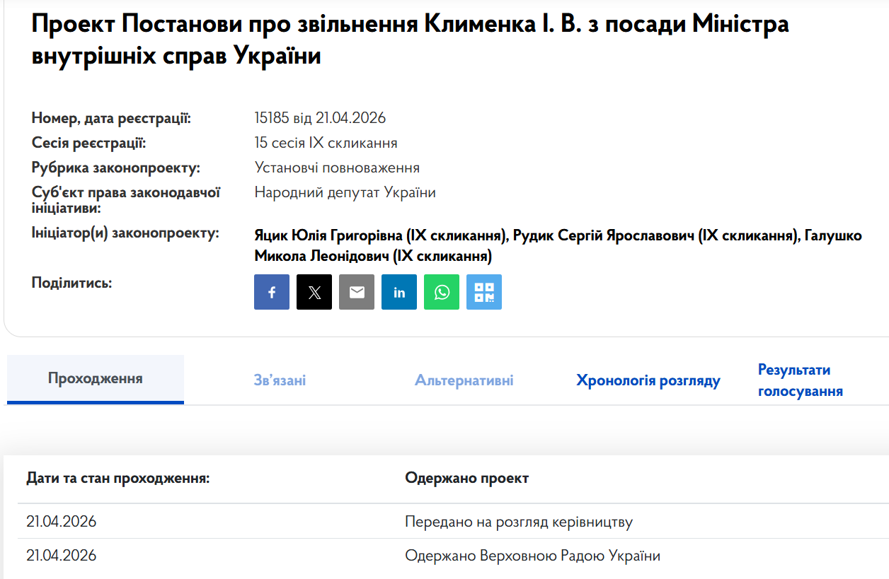 На сайті парламенту з'явився проєкт постанови про звільнення міністра внутрішніх справ Ігоря Клименка. Про це повідомляє «Главком» з посиланням на Верховну Раду.