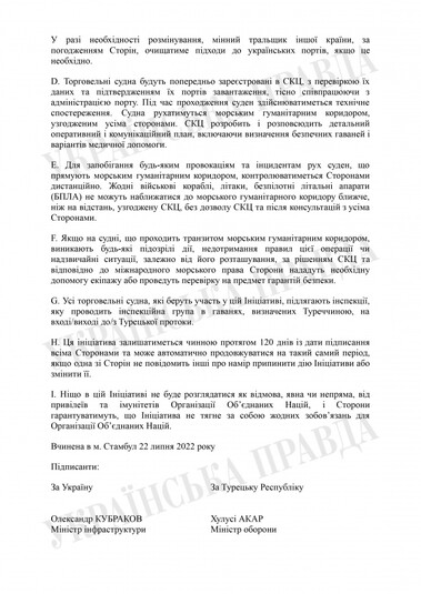 Українська сторона підписала з Туреччиною та Організацією Об’єднаних Націй угоду, яка включає зобов'язання сторін щодо безпечного функціонування експортних маршрутів у Чорному морі. Такий ж документ підписали Туреччина, ООН та Росія.