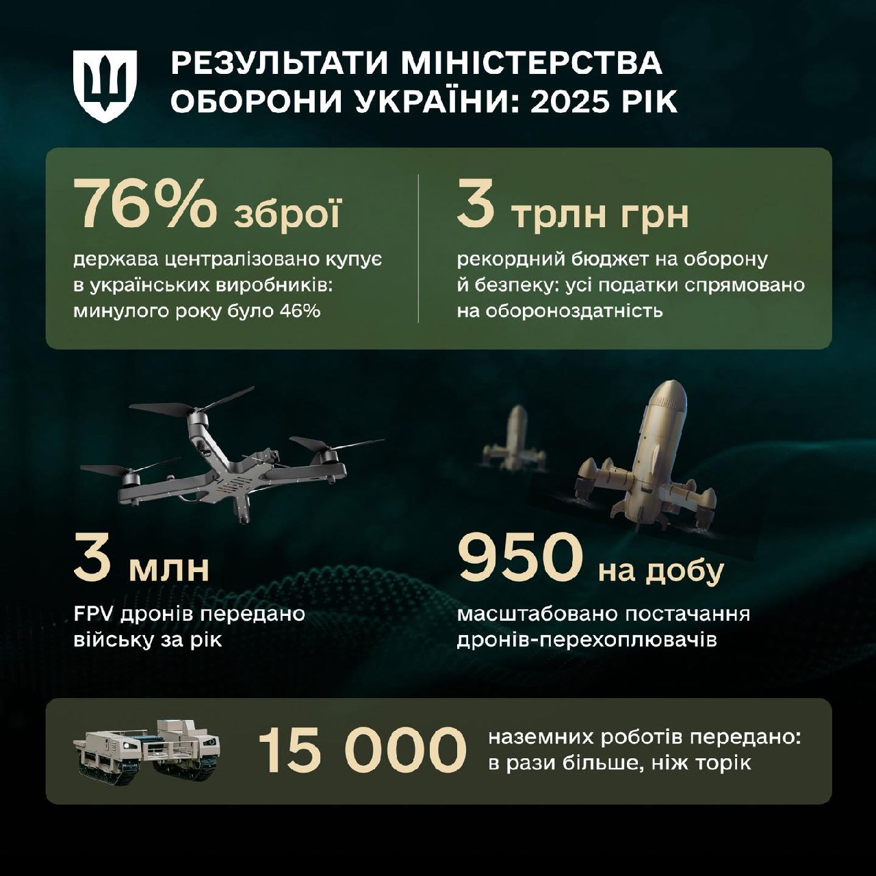 76% всього, що централізовано купує держава, вона купує в українських зброярів. Майже кожен дрон на фронті – українського виробництва. У 2025 поставили у військо рекордну кількість FPV-дронів і почали масові поставки наземних роботів та дронів-перехоплювачів.