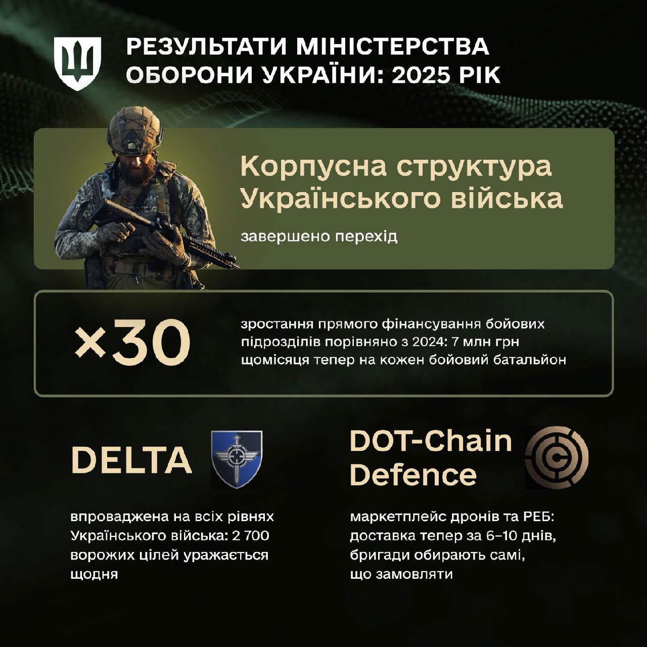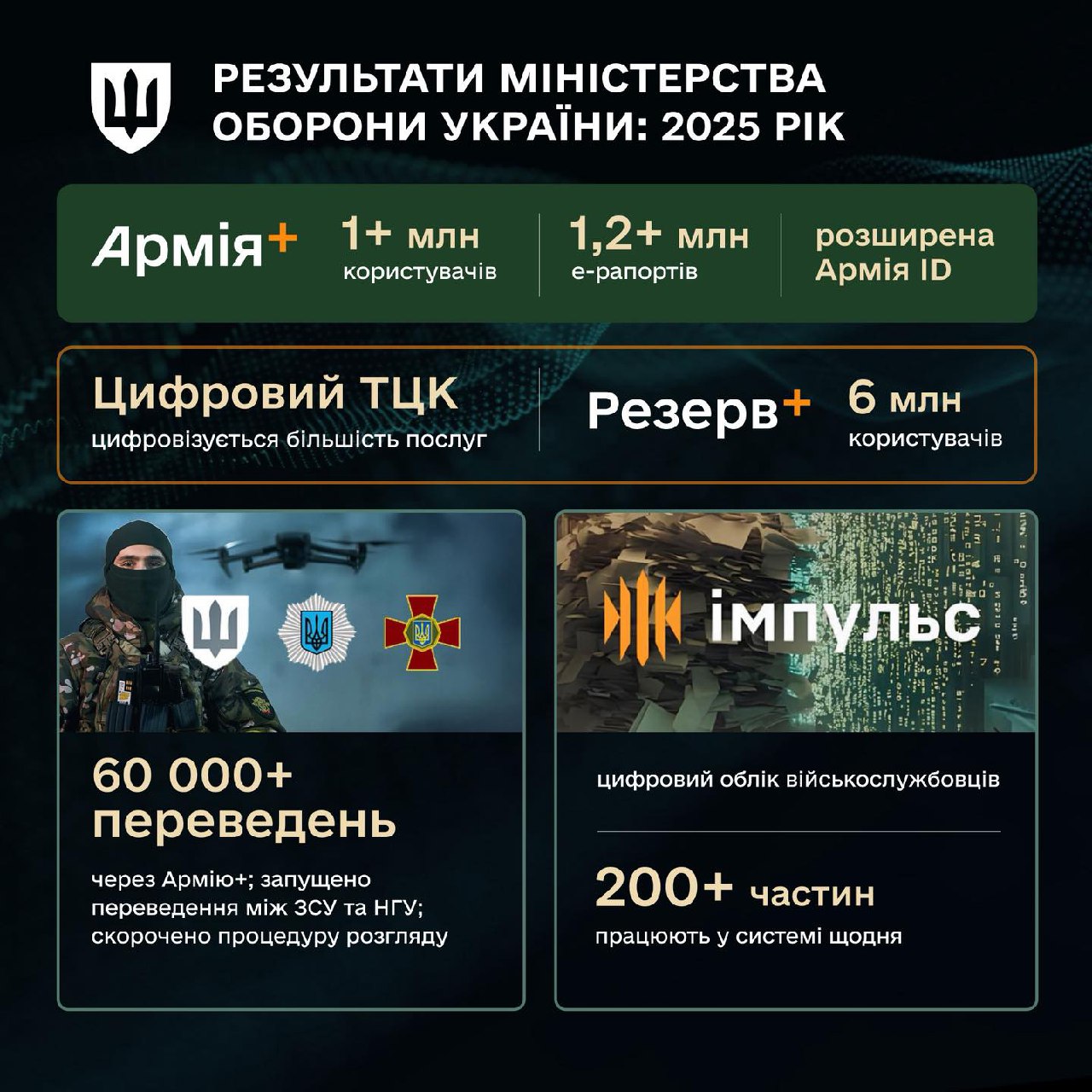 Зазначається, що Міноборони продовжує процес цифровізації. «Більше можливостей в «Армія+». Триває цифровізація ТЦК. Дельта стала обов’язкова на всіх рівнях війська. Переведення між ЗСУ та НГУ. Система «Імпульс». Медична інформаційна система і багато іншого», – зазначає пресслужба.
