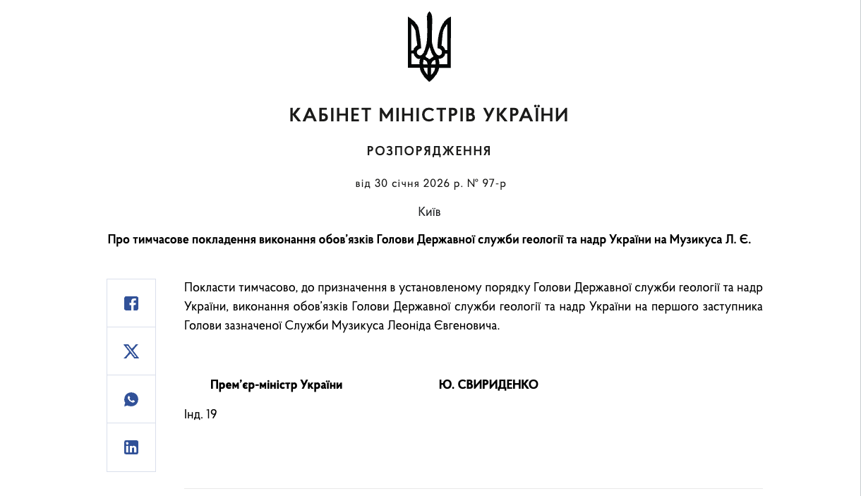 «Покласти тимчасово, до призначення в установленому порядку голови Державної служби геології та надр України, виконання обов'язків голови Державної служби геології та надр України на першого заступника голови зазначеної Служби Музикуса Леоніда Євгеновича», – йдеться в документі.