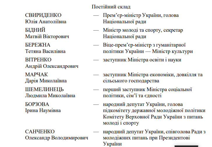 Відповідно до урядового розпорядження, головою Національної ради з питань молоді призначено чинну прем'єрку Юлію Свириденко.