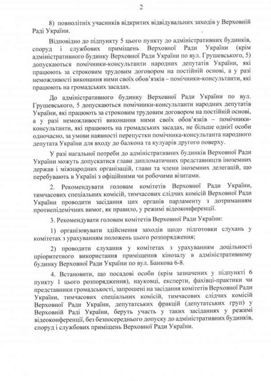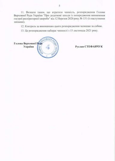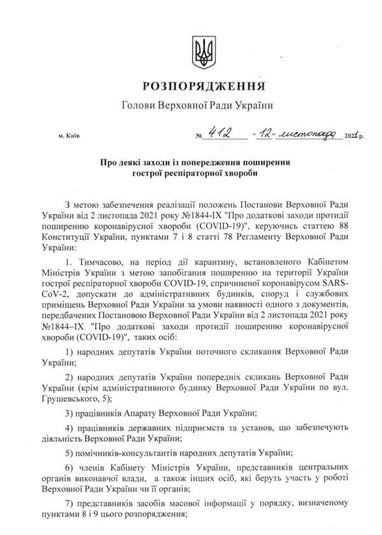«Голова Верховної Ради України Руслан Стефанчук підписав розпорядження № 412 Про деякі заходи щодо запобігання поширенню гострої респіраторної хвороби», – сказано в повідомленні.