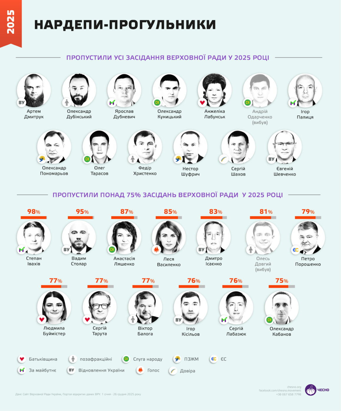 Є й новачки у списку прогульників, це нардепи Олександр Кабанов та Анастасія Ляшенко від «Слуги народу». А також став рідше відвідувати Верховну Раду Сергій Лабазюк з партії «За майбутнє». Відомо, що НАБУ підозрює його у підкупу топпосадовців у сфері відновлення. Також згадується Олег Тарасов, який раніше часто відвідував засідання, але цього року він встановив рекорд з показником 100% відсутності за 2025 рік.