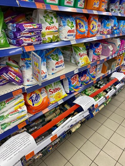 «Ось так виглядають окремі відділи деяких супермаркетів. Приклад успішної боротьби з панчохами та порошками від керівництва Кабміну», – прокоментував нардеп Слуга.