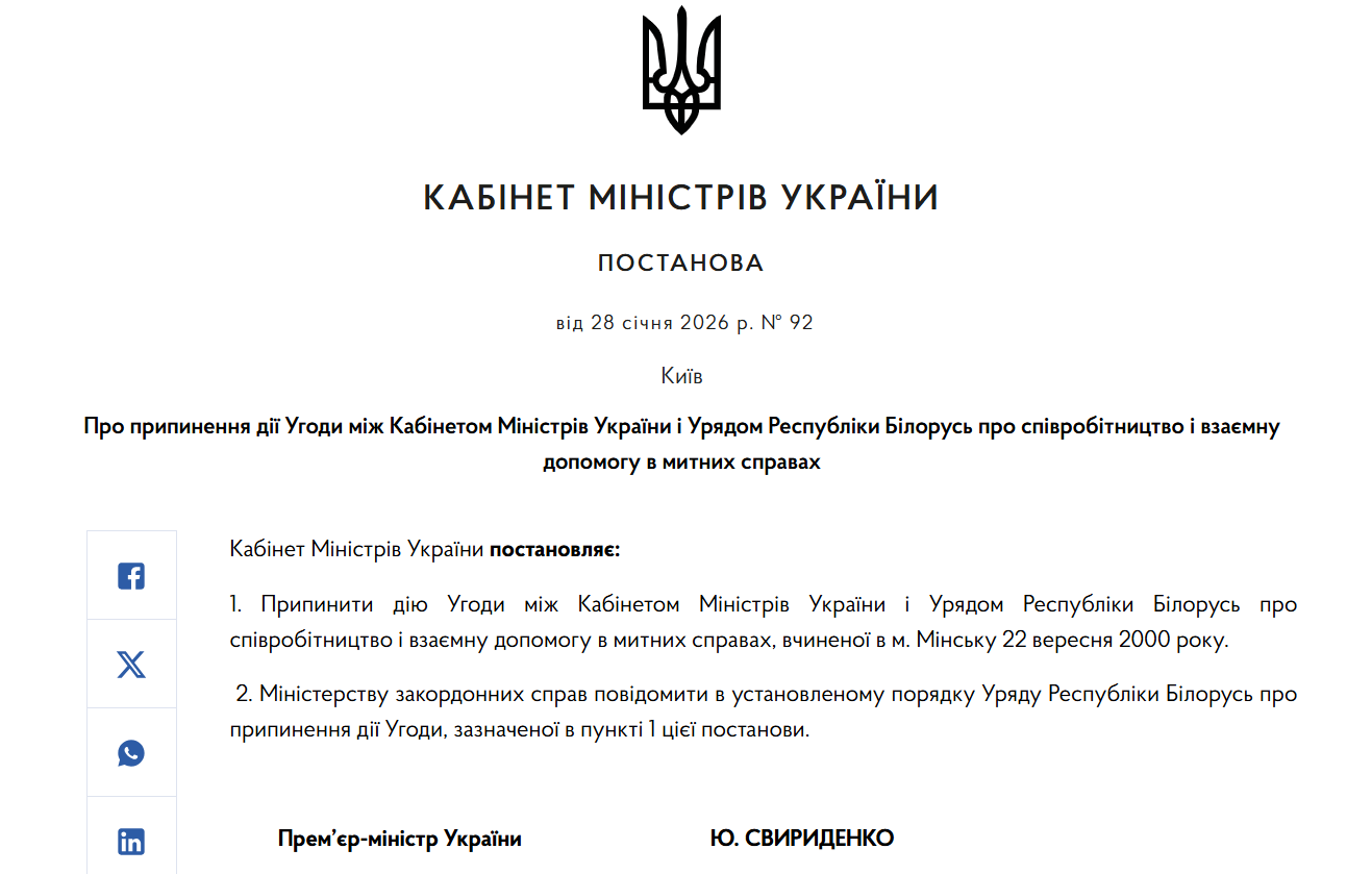 Взаємна допомога в митних справах: уряд припинив угоду з Білоруссю